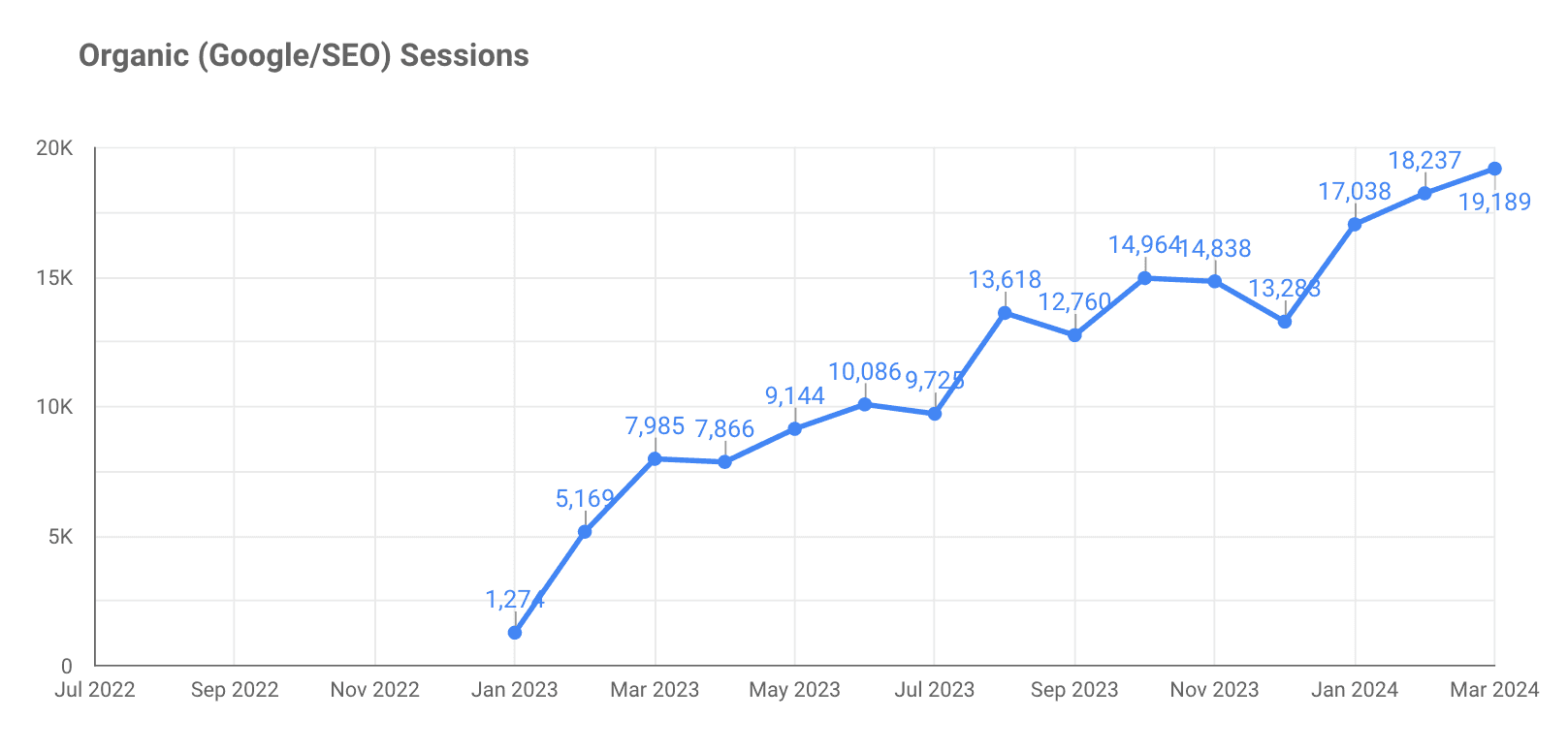 Illustrative view of traffic growth across a 14-month period (engagement lasted July 2022 — March 2024).